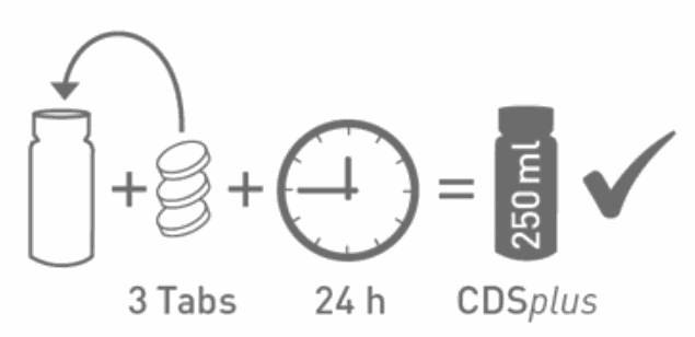 Ovo je uputa za dobivanje aktiviranog CDS proizvoda: 3 aktivacijske tablete (nemojte aktivirati dio tekućine, nego uvijek cijelo pakiranje) ubacite u 250 ml CDSplus proizvoda, zatvorite bočicu i pričekajte 24 sata na sobnoj temperaturi do završetka aktivacije. Vidljive pahuljice i čestice u dobivenom proizvodu su normalna pojava.